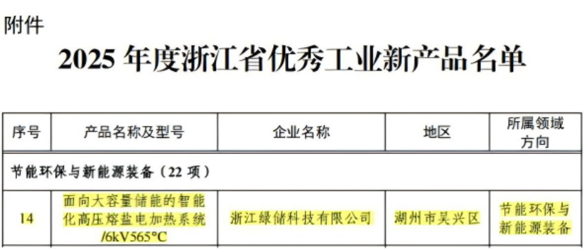 近日,浙江省经济和信息化厅正式印发通知,公布2025年度浙江省优秀工业新产品名单,浙江绿储科技有限公司自主研发的“面向大容量储能的智能化高压熔盐电加热系统(6kV/565℃)”成功入选名单“节能环保与新能源装备”领域优秀产品行列。